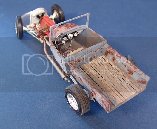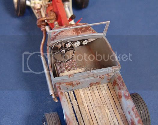 Thanks Murph, the bed boards are already glued down i used scraps of bass wood from one of my wooden ship models. Wait till you see what i have planned for the bed, both the battery and gas tank will go in there, the interior will get a large dice for the shifter nob painted red with white dots and i think the passenger seat will be just a wooden crate with rope seat belts, this has to be the ugliest car i have ever seen but it has attitude.