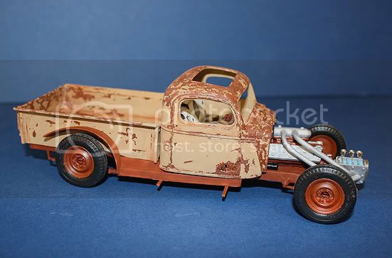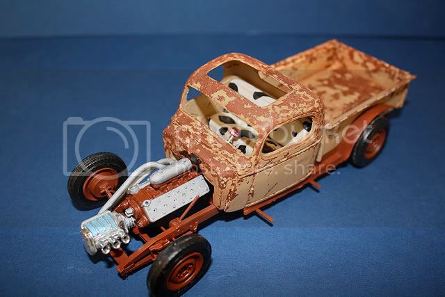 I love the engine and interior, but the paint and especially the rust holes are awsome.  I may go back and try and do the rust hole thing on my rat rod.  Yours looks great.