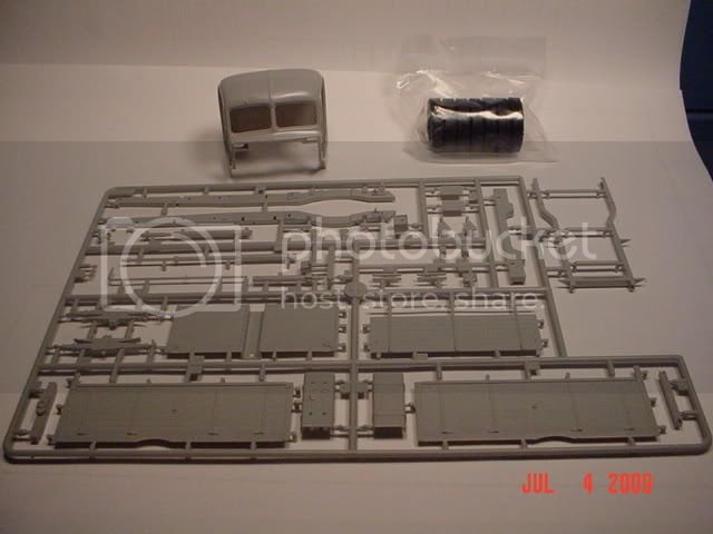 Starting with the box- shown in the upper right hand corner is the other side dump kit they have out now. On the box, you'll see the dump bed in the up position, this, aside from the paint/decals, is the only other major option you have to choose from. The dump can be positioned either up or down, but I think that instead of glueing the hydraulic lift in, I'd carefully glue just the two small side brackets so I could swap the raised or lowered piece in or out pending my mood. There is a number plate to be added if you want, as well as dumpbed height extensions or a headache rack across the front of the dump bed.