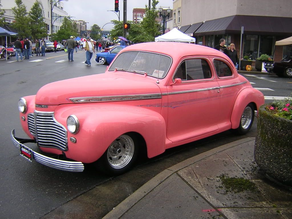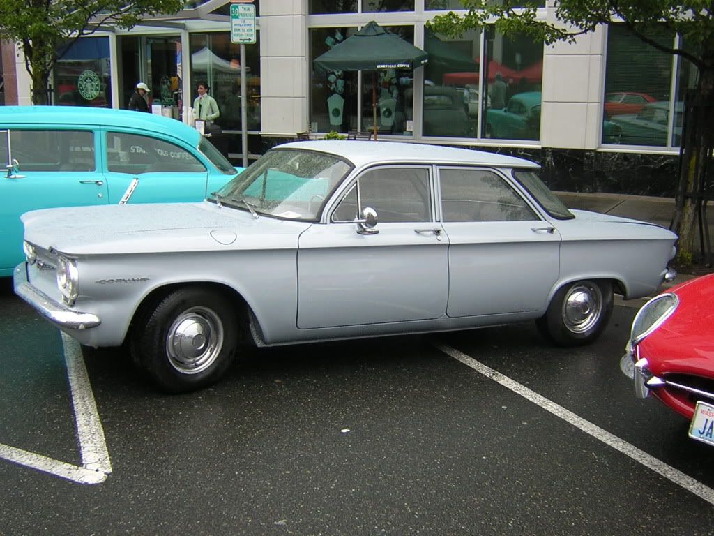 My masculinity isn't threatened by pink cars, but that gray 4-door Corvair is much more my style.