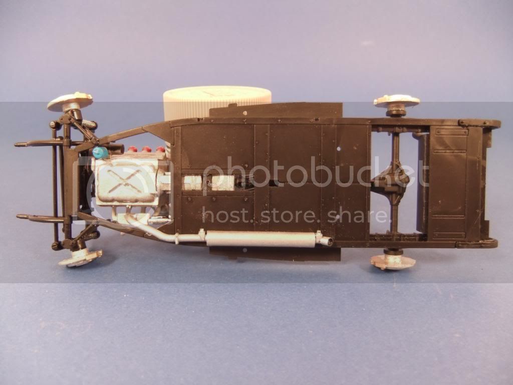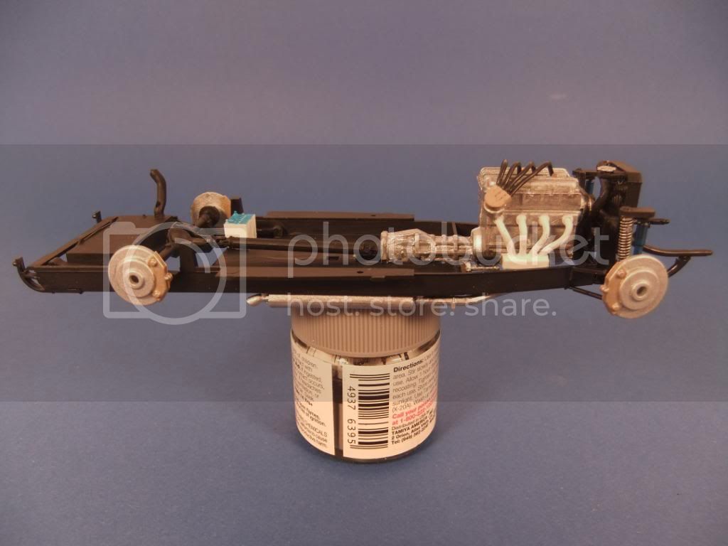 The motor fits in pretty well but the inner fenderwells have to be removed for clearance for the header, forward injector tube and the lower LH side pump drive. I added almost a 1/4" to the driveshaft length since this combo was alittle shorter. Also took an electric radiator fan from the spares box and made it fit on the back of the radiator since there's no motor fan and grabbed 4 rotors from some spare '32 ford streetrod kit parts to use here as well.