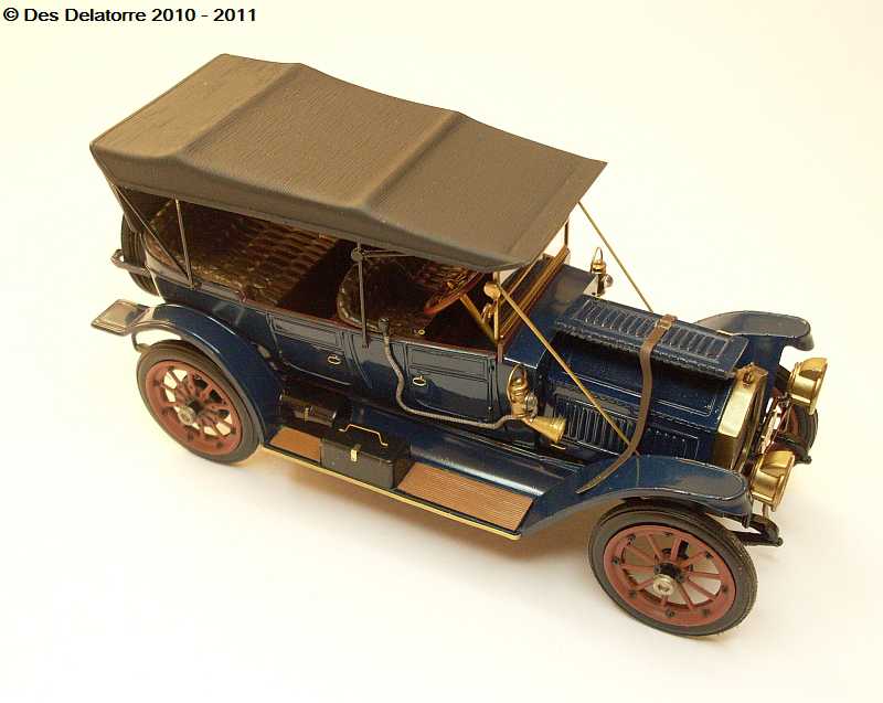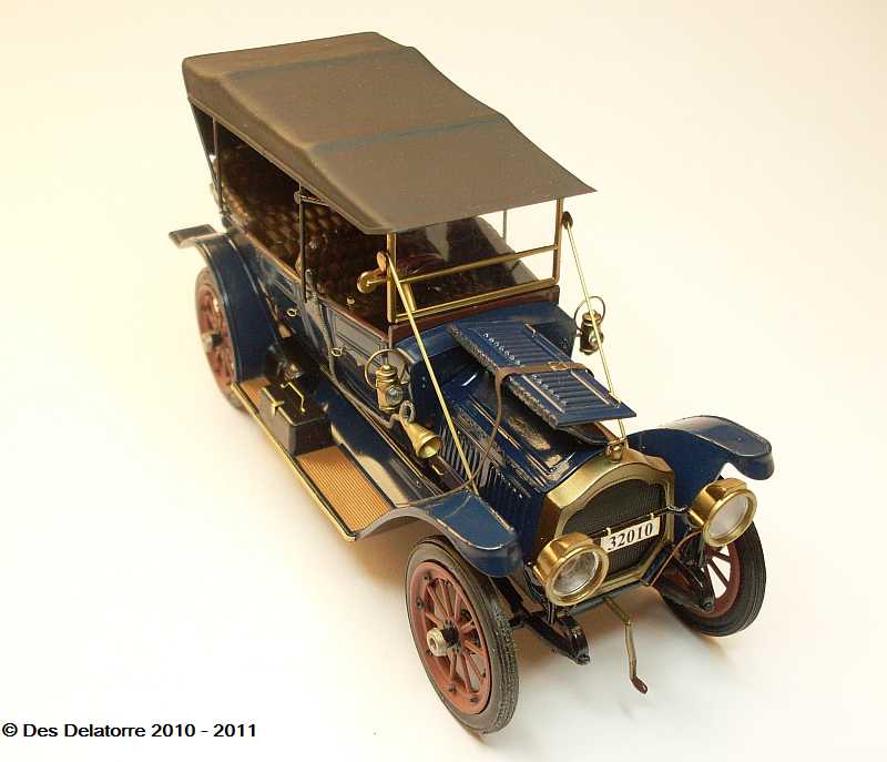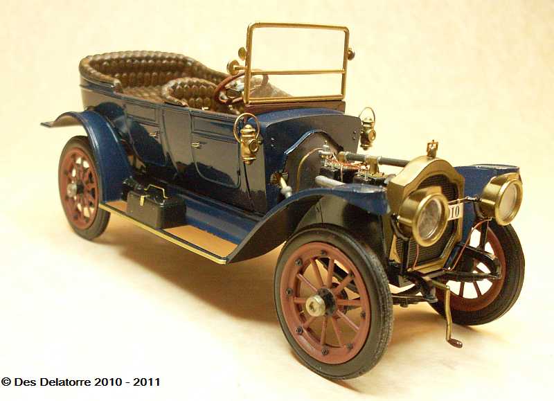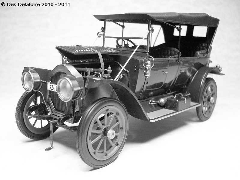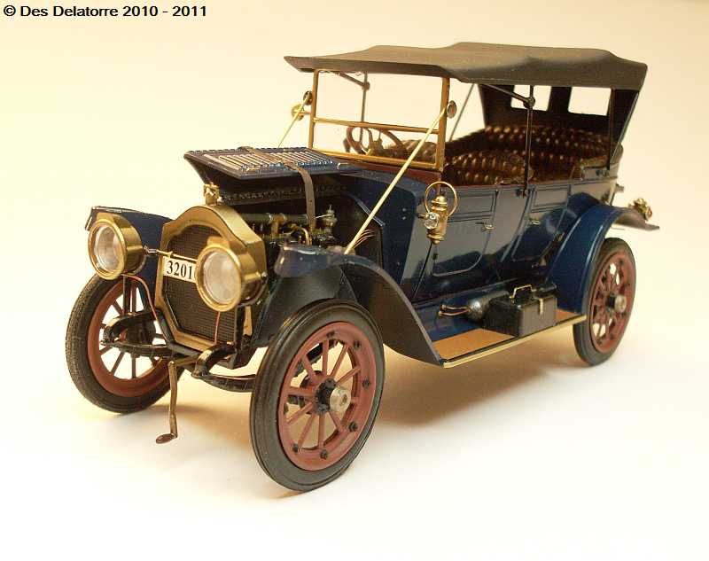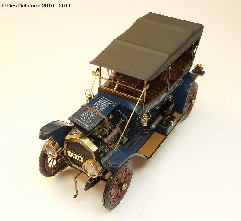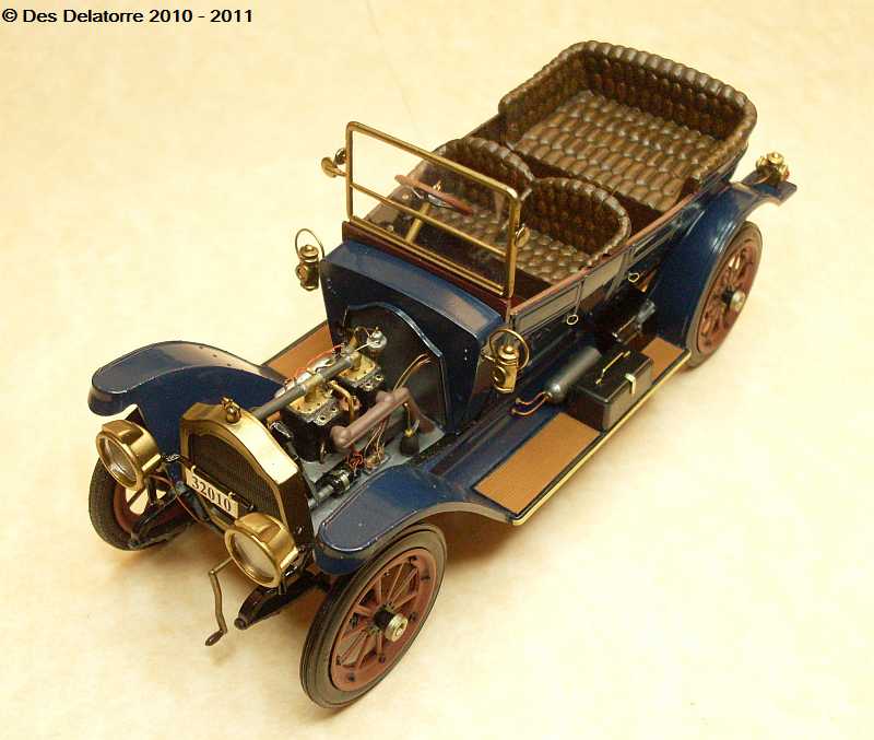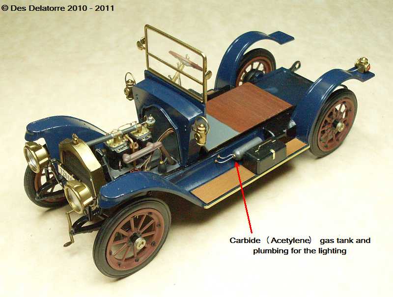 The kit was supposed to have brass plated parts but I only ended up with grey plastic, so I have painted all the brass bits with Alclad polished brass over a coat of Humbrol gloss black enamel, it turned out pretty good. The number plate is a piece of brass sheet with a white decal backing and some numbers from a left over decal sheet. As this car had carbide (acetylene) lighting I made an acetylene tank and mounted it on the running board, I connect some plumbing using copper wire. The kit supplied windscreen was very scratched and way too thick so I used acetate sheet.