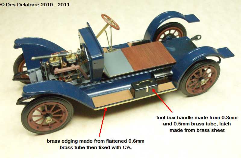 I've decided to paint the car a dark blue, I'm using Humbrol enamels which when thinned with enamel thinners by 50% sprays beautifully. The tool boxes were just a box so I added the swivel handles from brass tube, the latch is a piece of brass sheet. The running boards had a brass edging so I flattened some brass tube and glued it to the edge.