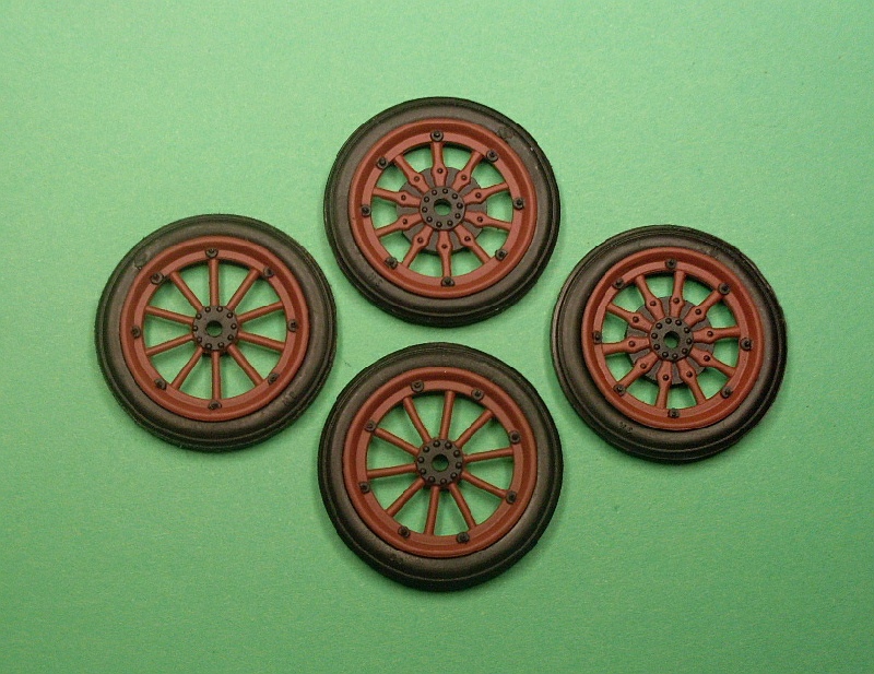 The next photos show the body painted and fitted, I made door handles from 0.18mm copper wire painted brass. The seats are also fitted, they were first sprayed with Gunze yellow then I used Raw Umber oil paint doing a stipple effect. When it was dry I sprayed it with Humbrol Matt Cote then went over it again with the Raw Umber but this time very diluted, just a wash. A final coat of Humbrol Satin Cote finished it off.