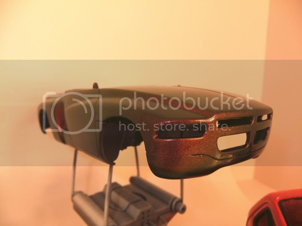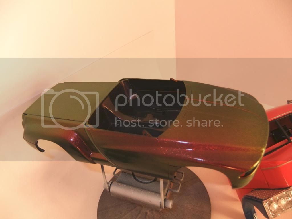 Oh, this truck has a base coat of 3 mid coats of sealing primer{lacquer paint!} that was 2500 wet sanded between, tamiya's gloss black base spray{pretty darn sure that's acrylic lacquer since it's foam safe} that was wet sanded with 2500, then 3 light coats of the flipflop color of alcladII's prismatic maple{copper red to green}...No wet sanding here or it'll screw up your color changing!, then 3{so far!} coats of clear testors lacquer which will be wet sanded later today then get more clear on top of that....I want it to look deep.