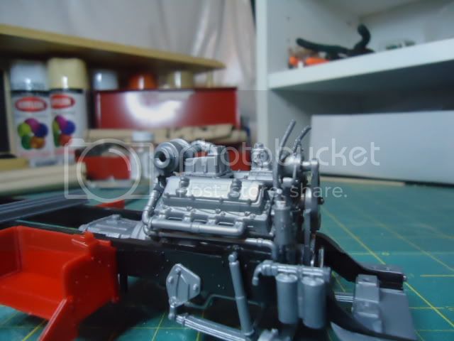 The first one is a AMT 1974 Mack R685ST. The plan is to do A.P.A. Black frame with red cab. The engine & transmission are Tamiya Gold Leaf X-12.