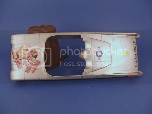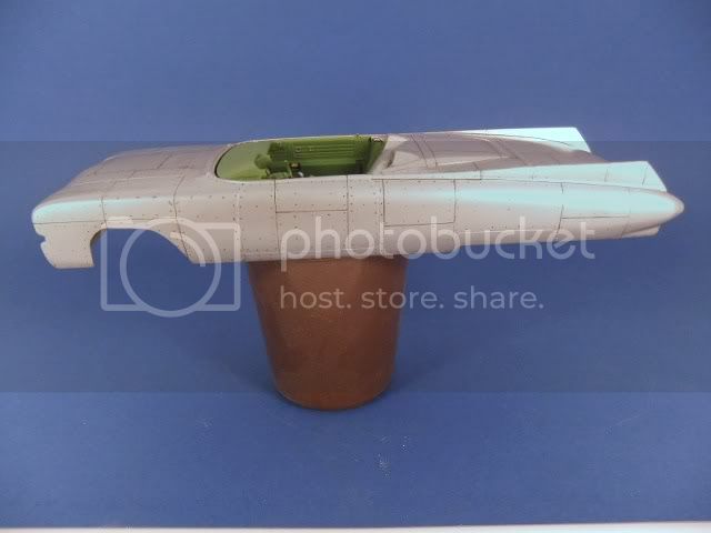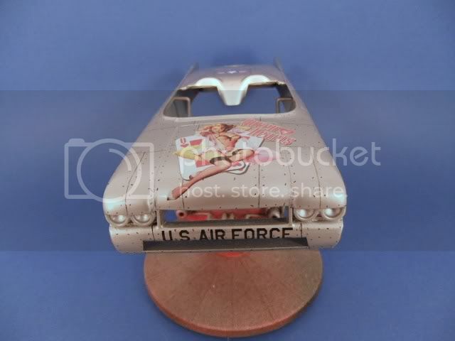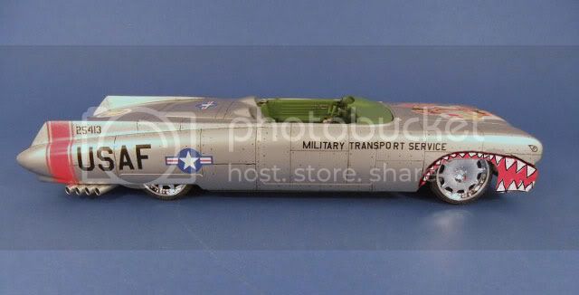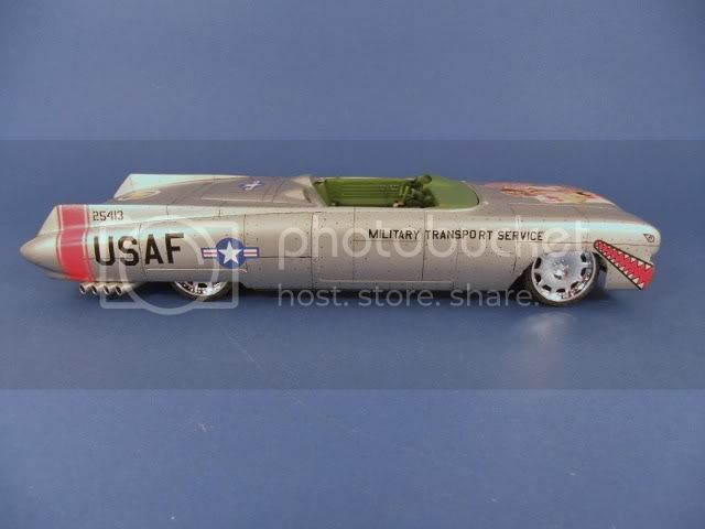 This car will be built as a rolling road bomber and the olive drab paint is the next color to go on after I do the needed salt treatment- the reason she's silver now is because that's the underlying color coat to simulate bare metal, I'll add intermittant areas of water and table salt sprinkled on that to be able to knock those areas off after the O.D. paint goes on for a "lost paint chips" look. Yup, paint right over the salt after it dries- then rub or knock the salt off. I want her to look "war weary"{...used}.