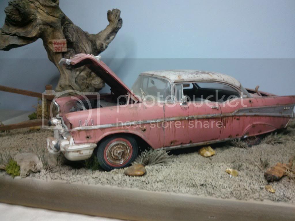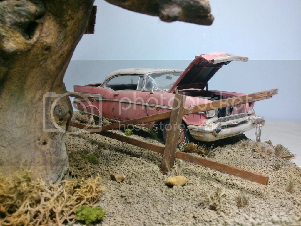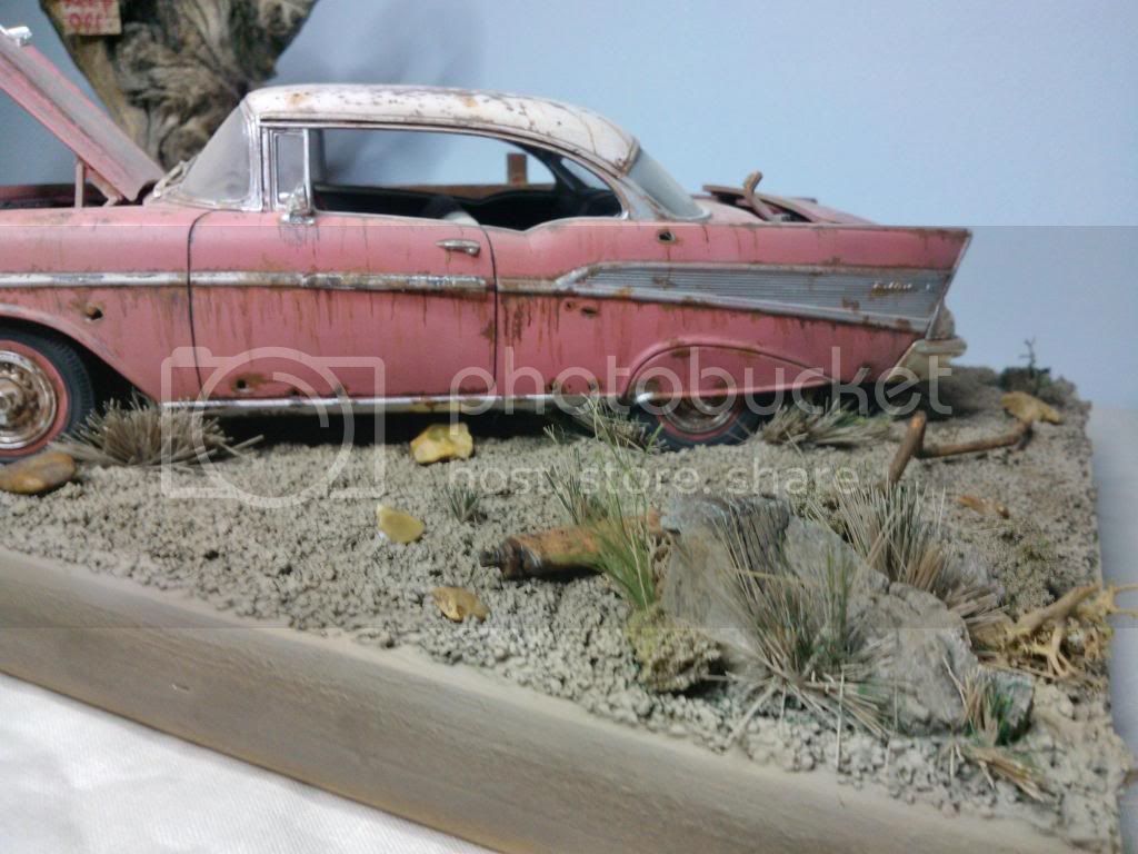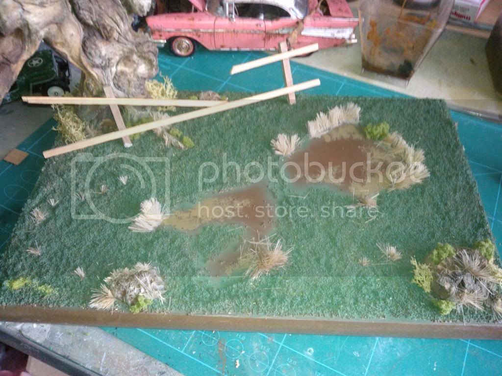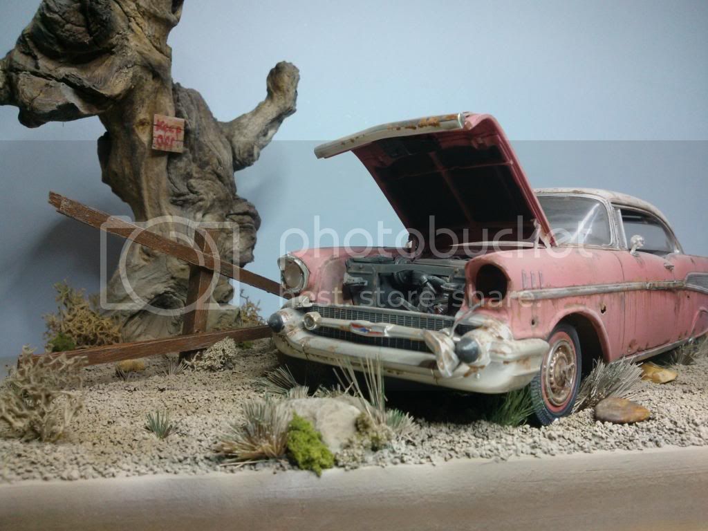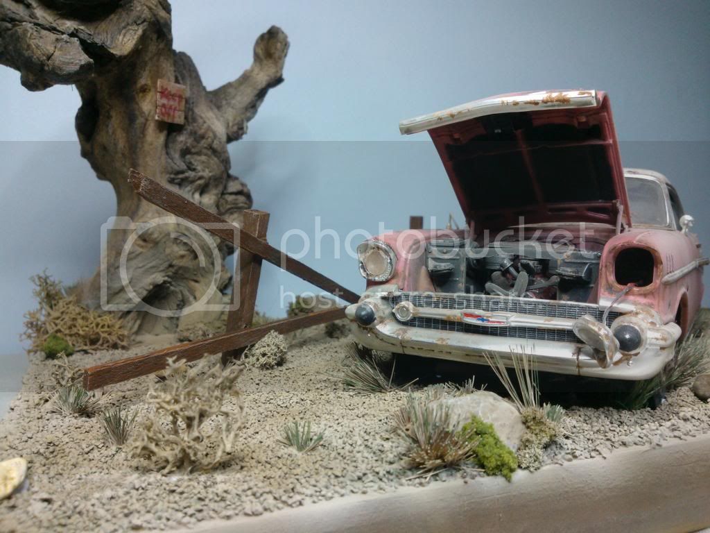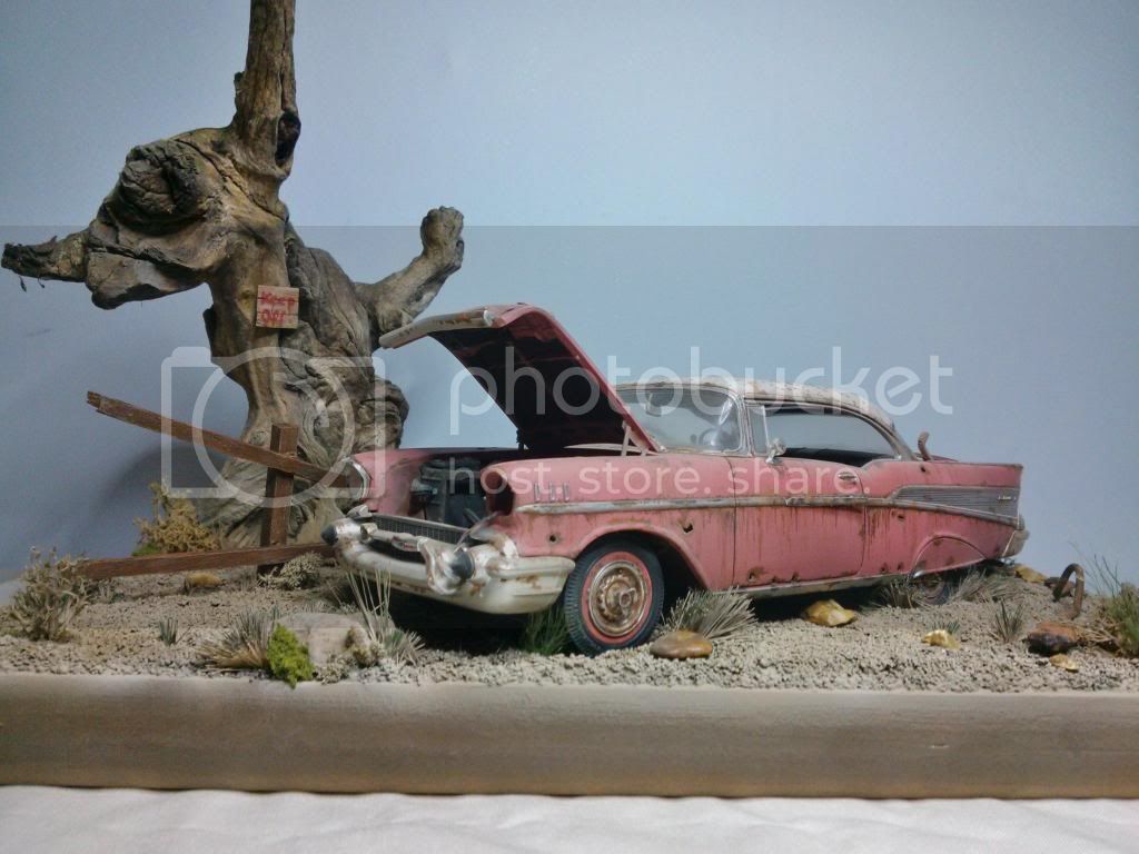 This the base as of today,painted up, but still needs weathering, gras added but more to come, and tree screwed to base. I closed the lid on the car so its just open a little, it looked too uniform. Will paint the grass over next couple of days and add car to base. A few little extras to add to base an it will be done.
