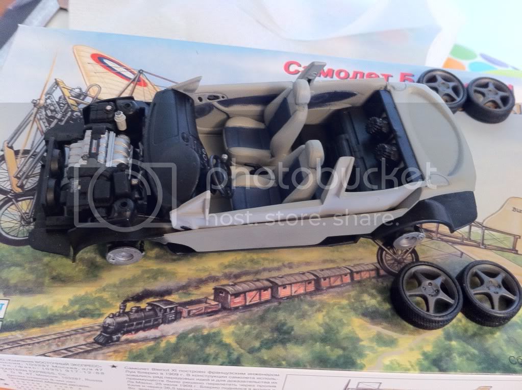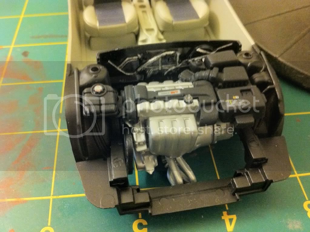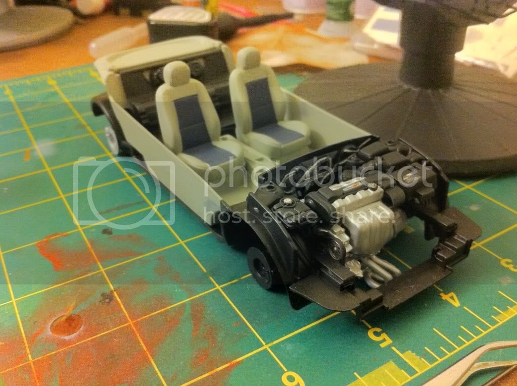Overview of most of the work to date. Interior painted with Testors Dark Aircraft Gray from a rattle can and cushions were painted with Vallejo Model Air Intermediate Blue. You can see the speaker system the kid replaced the back seat with.