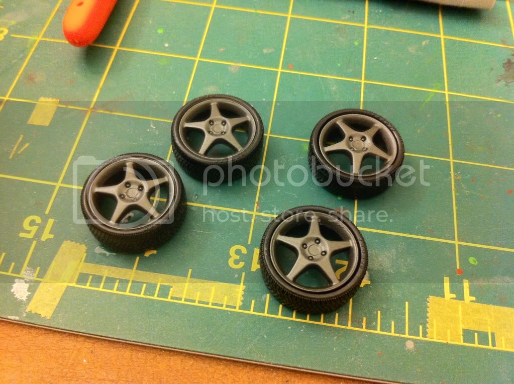 The hubcaps were painted with Testors Metallizer Gun Metal. They will match the aftermarket side sills and bumpers.