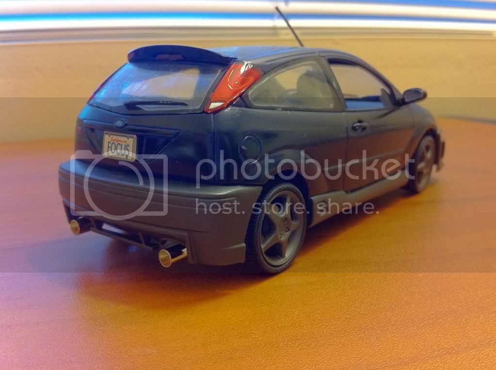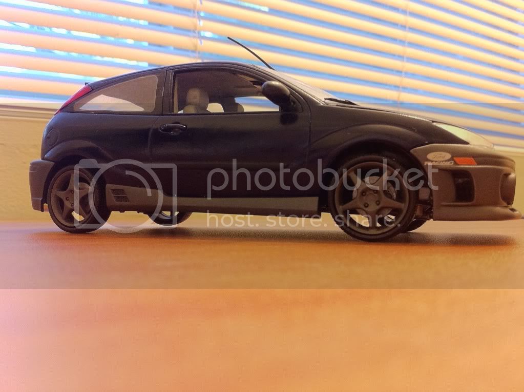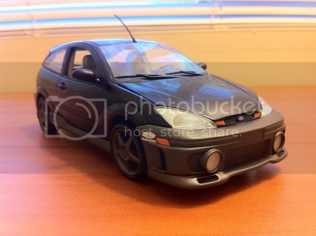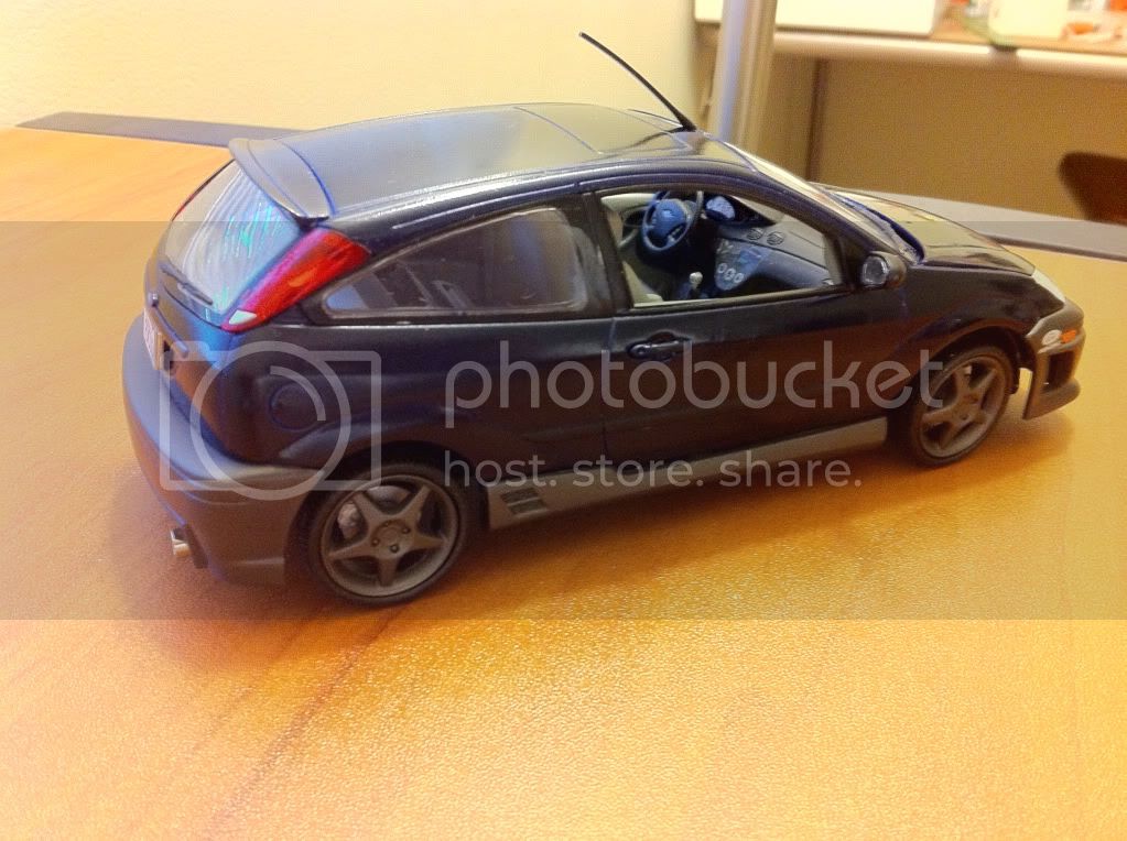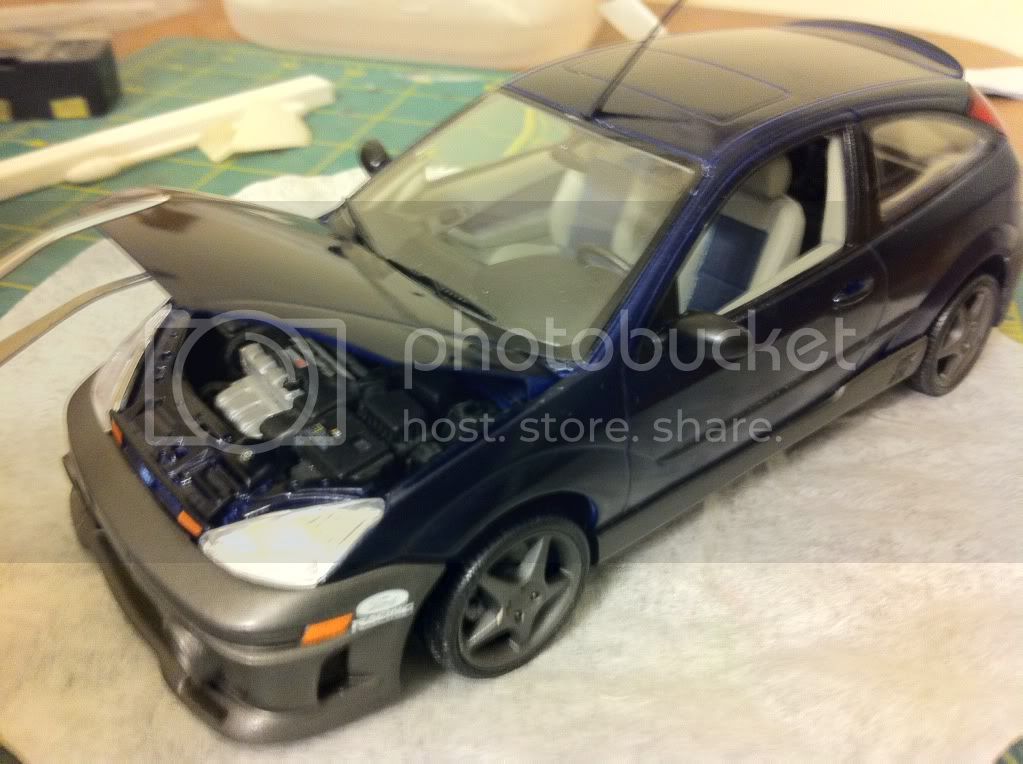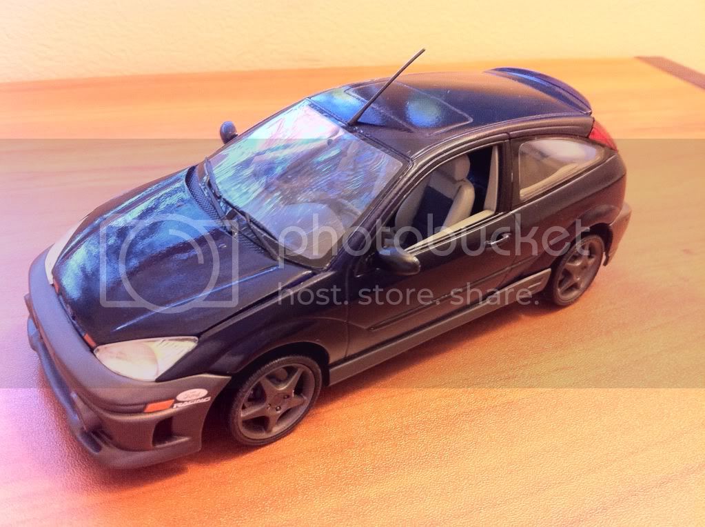 Mike, glad to see it's back to where it was. As for my Ford Focus, she is about done. I attached the last couple parts (side-view mirrors and stretched sprue radio attenae). Afterwards I noticed that there was a smudge in the roof gloss coat thanks to pressing a little too hard with my finger. After polishing that out I was all ready to call it done when I realized I polished away part of the paint job along the longitudinal seam at the top corner above the doors.