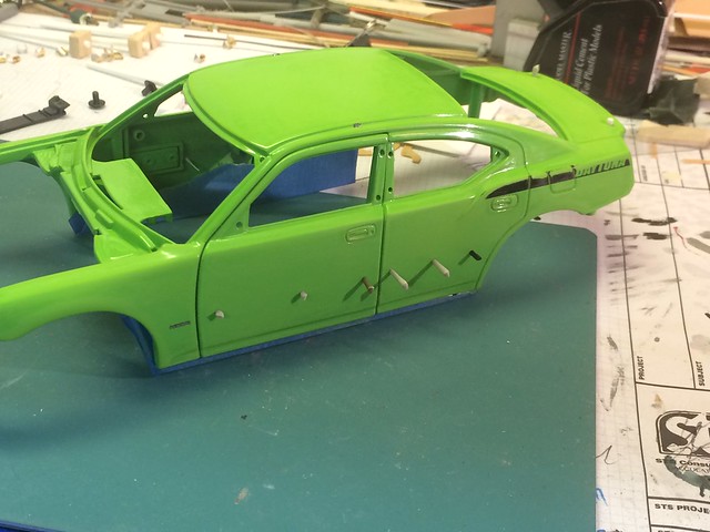 I used the stubs from stretched sprue as tapered plugs in the holes in the doors and trunk lid, superglued in place. Then I cut them off and sanded smooth.