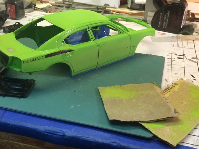 I'm slightly embarrassed that my kit is pre-painted and screw-assembly, but I got it at a good price on clearance, and I'm trying to make it better than that. Anyway, here I've knocked down the gloss with 220 grit sandpaper to help my primer adhere.
