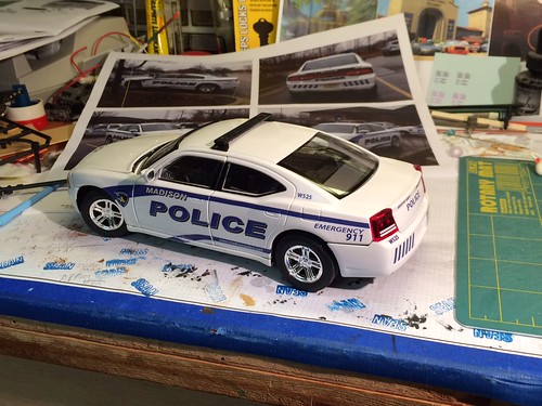 Moving along. Here she is with all the kit parts attached, and custom decals on. The kit had the computer and the light rack base, but not the clear parts for the police lights in this boxing. I just have to add a scratchbuilt push bar and light bar. I had a spotlight in my spares (a common customization in the 1960's, I guess.)