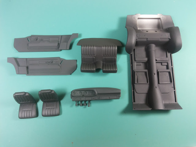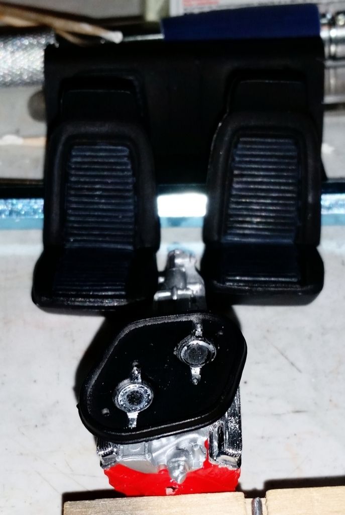 The instructions said to paint the seats satin black, I did the field in flat black and the tufted parts in gloss black. Then I ran a wash of Panzer gray over the tufts and drybrushed gloss black over the tops to give the seats that showroom fresh Chevy look.