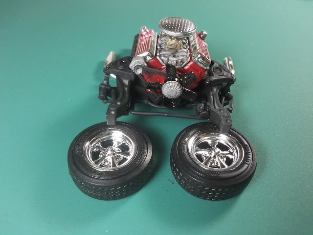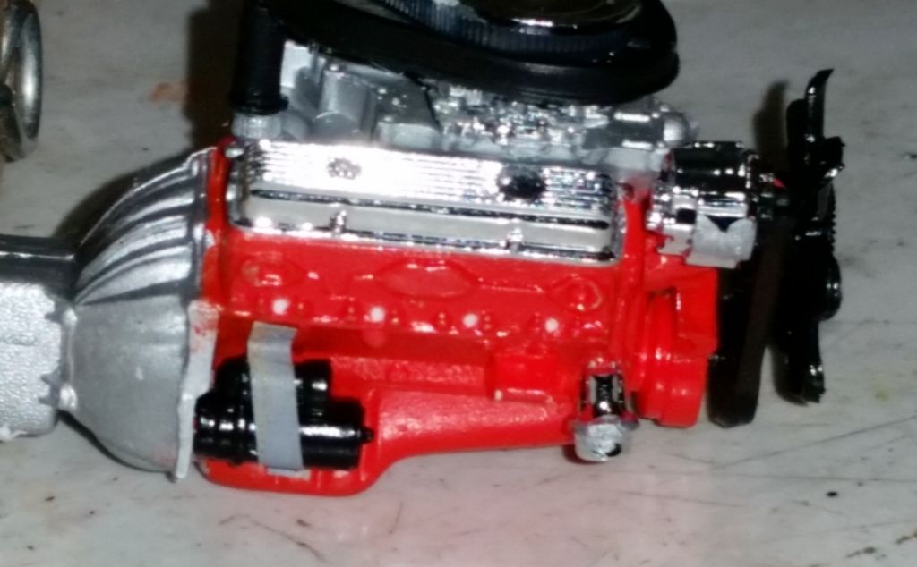 The Chevy is strong with the engine. Even after I cleaned the chrome off of the contact points no styrene glue would bond them. I finally held it together and super glued the parts in place. And why would anyone chrome parts on a Chevy, they're just gonna rust anyway.