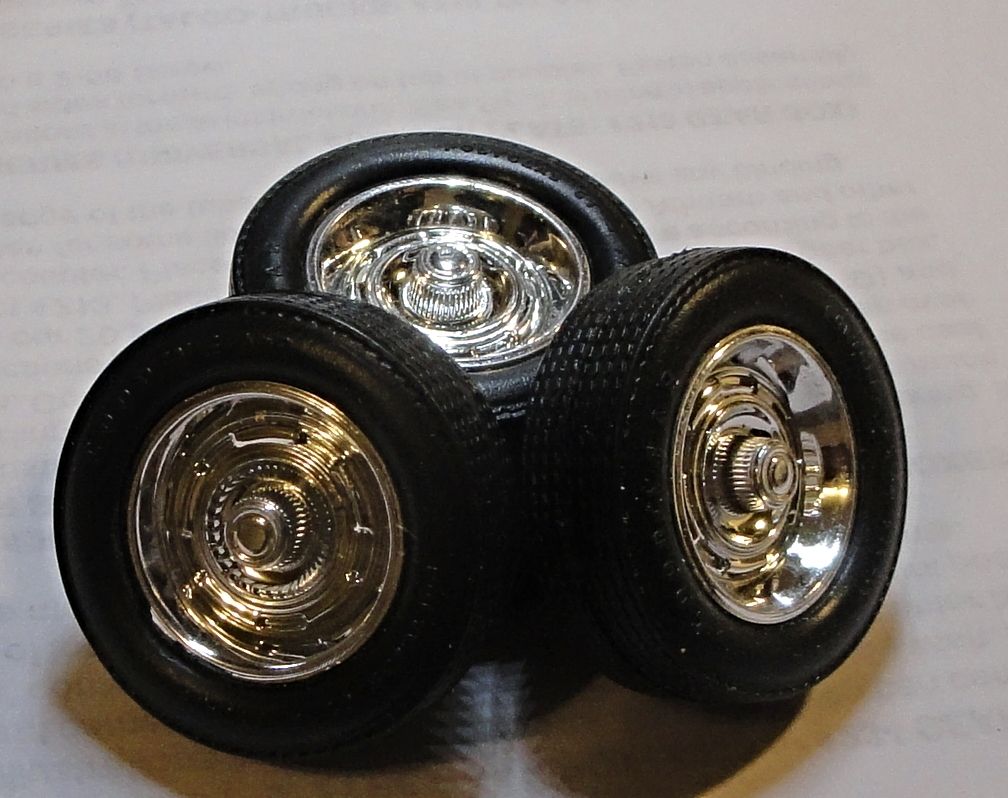 I found out on this Chevy, it's best to build the wheels by trapping the tire (tyre) between the halves before gluing them together. Have the warm the tire with the hair dryer before I can push the wheel assembly through.
