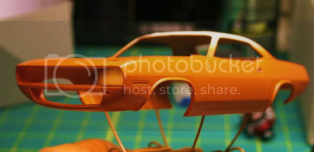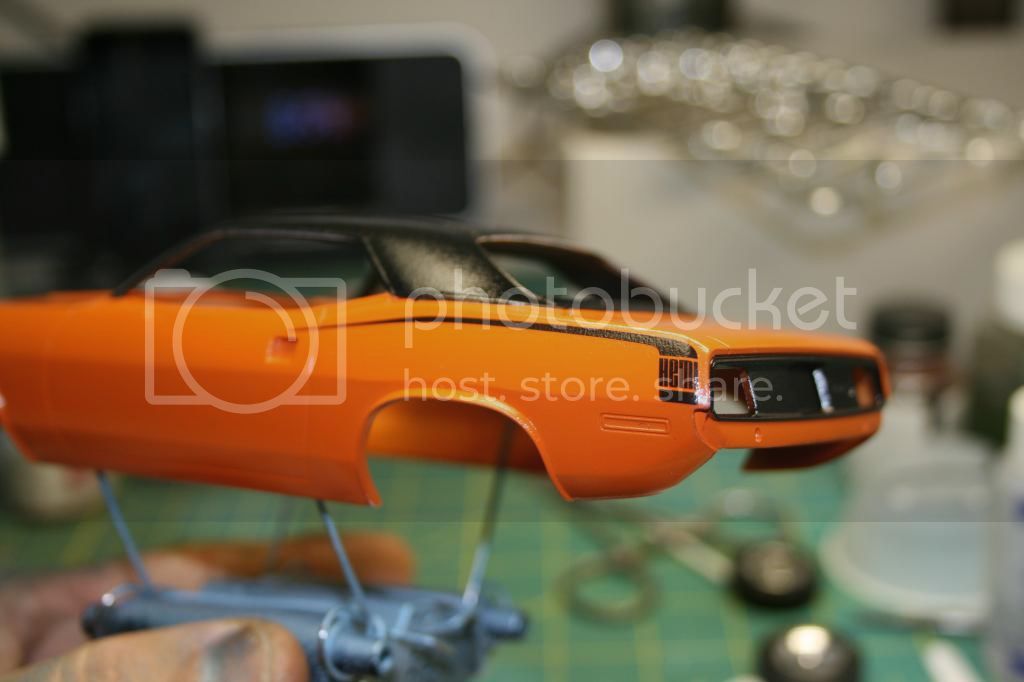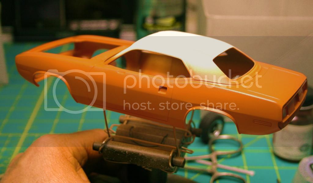 Got some GO MANGO orange laid down on the Cuda tonight. I started out with two coats of Tamiya white primer, wet sanded it, then sprayed on 3 coats of body color. When this dries in a couple days I'll sand it down and spray another heavy coat of color. Then I'll mask everything off and spray some satin black for the vinyl roof.