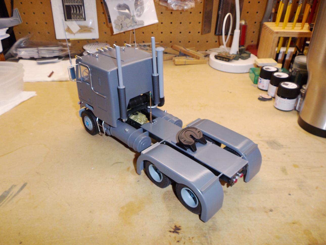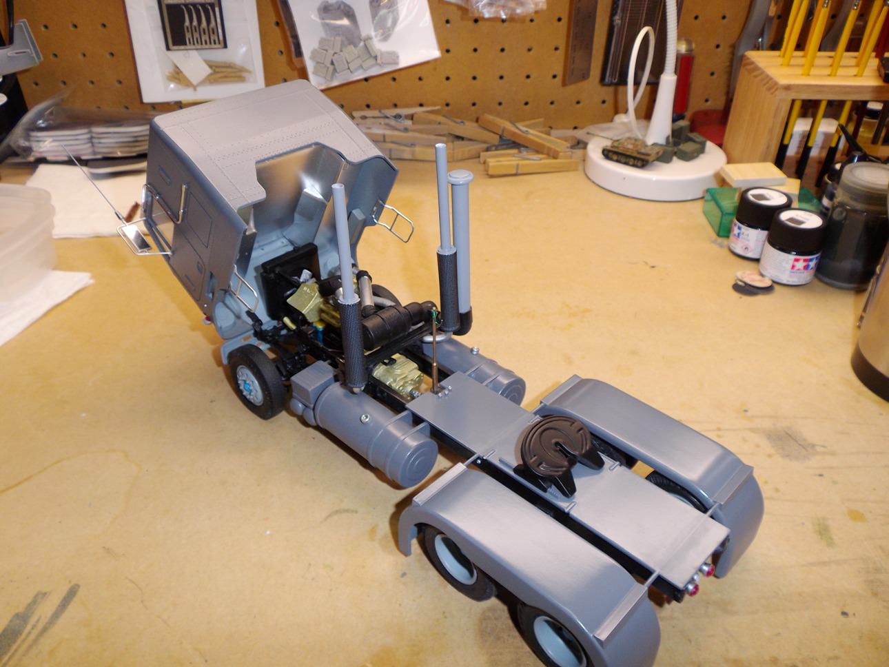 Really not a lot left to do. Darken the insides of the exhaust stacks for one, but unless YOU ALL see something else that I missed? Decals will have to wait. I was going to use this truck to pull my tanker, but because this is my first truck, I'll build my Kenworth stretched for that now that I have some experience with these kits. This truck may pull my flatbed.