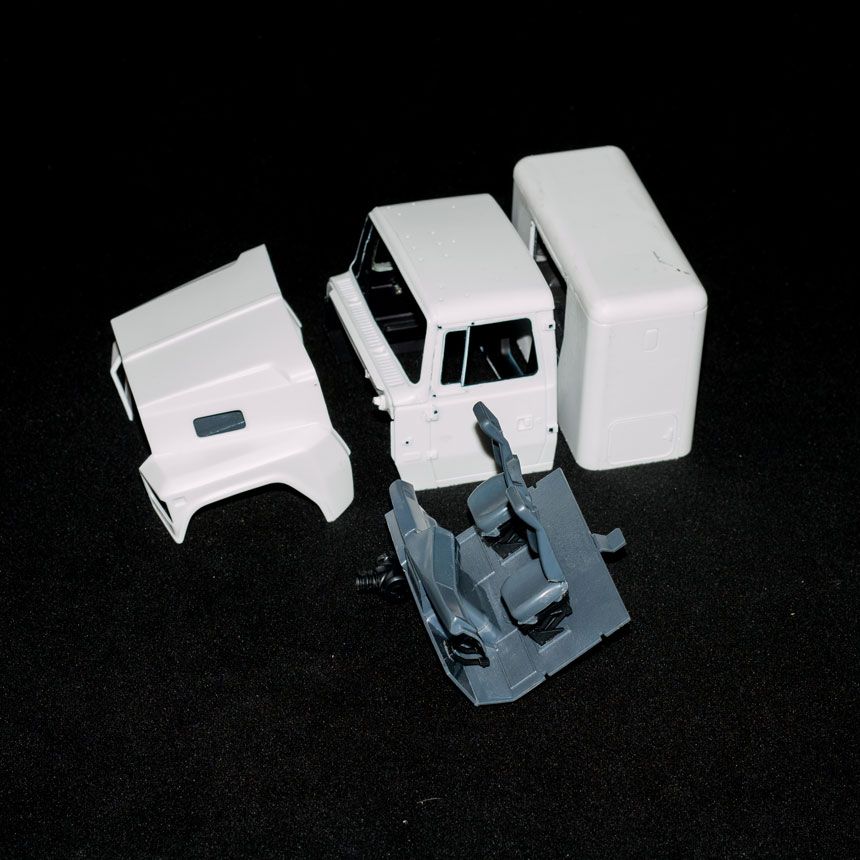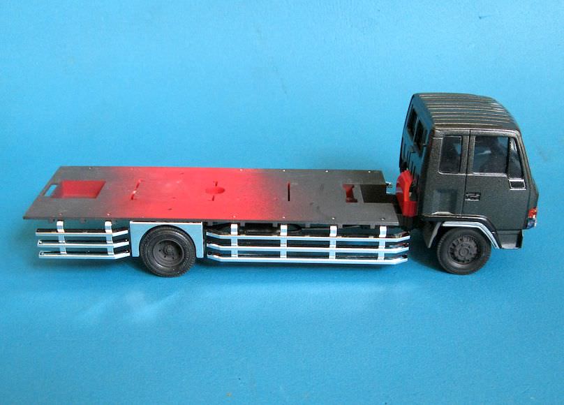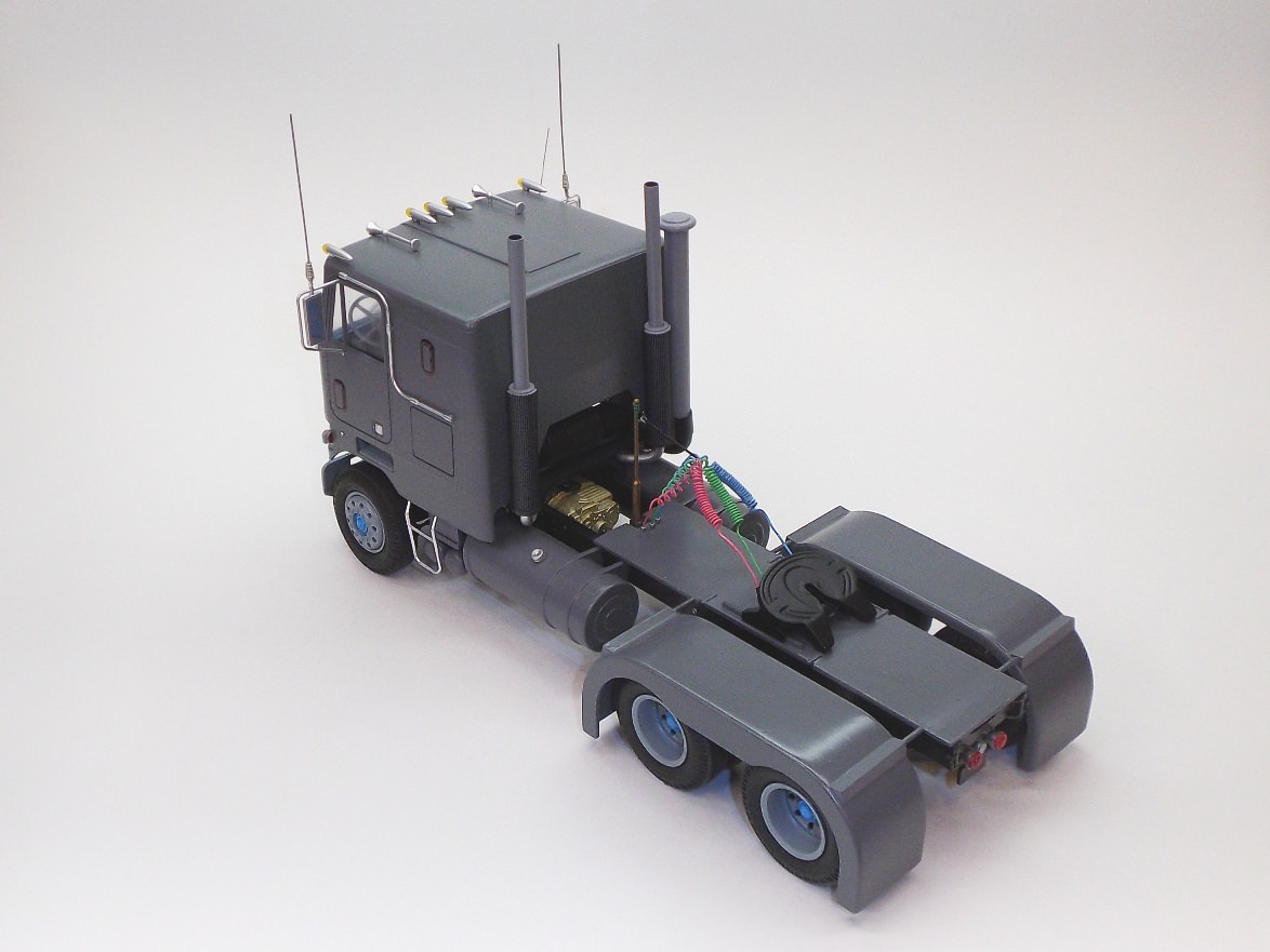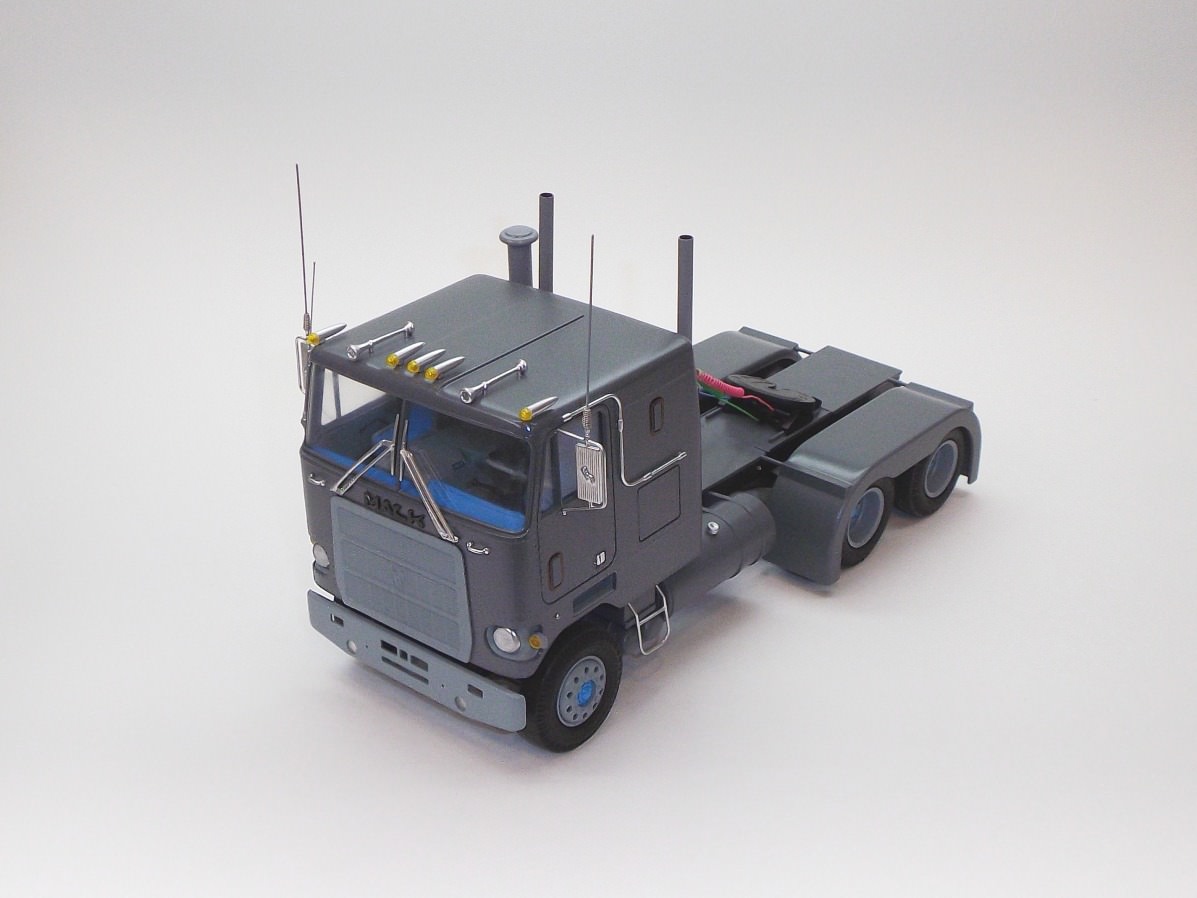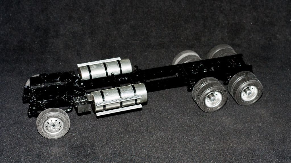 looking really nice, Gabriel. To take the shine off of the tires, you could try some 220 grit sand paper. That should dull them up a bit. Now, I know you're trying to make an accurate DM600 from this kit, so I figured I should tell you: MPC messed up with the tires, they all shouldn't have the same tread pattern. All of the tires are steer tires; there are no drive tires in the kit. The drive tires have a different tread pattern.