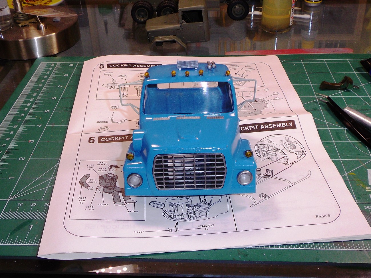 I made a ignition coil out of Evergreen tubing, and a little putty that was sanded to shape to represent the cone top. I used a generic bottle to represent the overflow bottle from my spares box. Unfortunately, I just forgot to photograph the assembly before installing the engine. I drilled out the distributor, and glued 9 Blue ignition wires for the plugs plus the one for the coil. Then glued the wires in place. The ignition wires are strapped and attached to the front of the valve covers on the real engine. I've wrapped them, but haven't as yet glued the wrap to the valve covers. I also used bits & pcs to make the breathers for the valve covers. If you look at the front of the engine, you can see the Aluminum mounting plate and on one side the over flow bottle, and on the other side the top of the coil with the ignition wire. You can also see that both Valve covers have a breathers made from more bits & pcs.