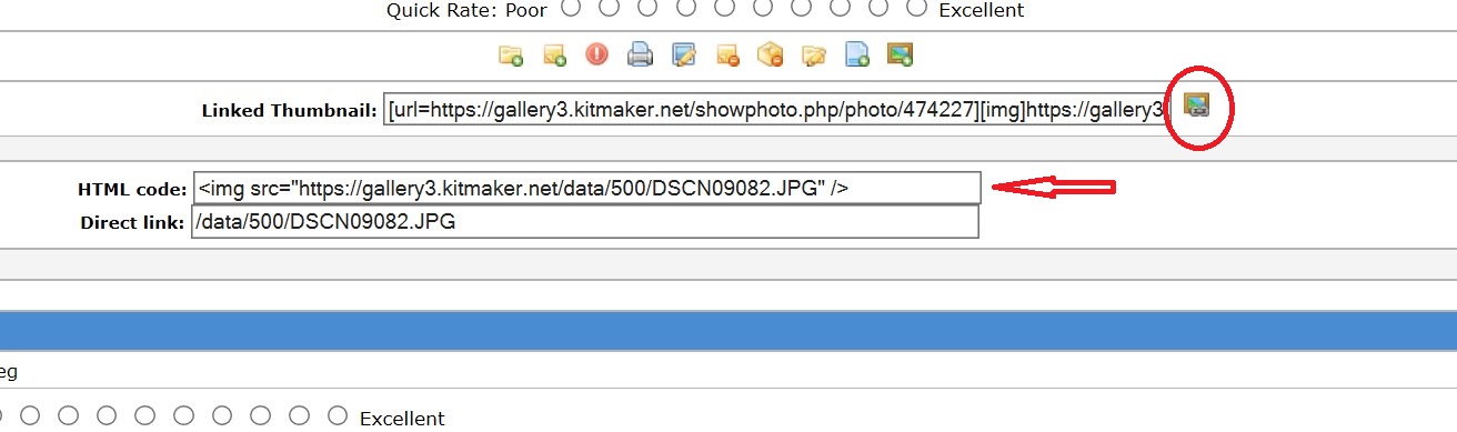 Once you get the images loaded into your gallery, you will see a brown button to the right of the "Linked Thumbnail" box at the bottom (circled red in the image below). Click this button and a couple of extra boxes will appear below it. Copy the "HTML Code" (red arrow in the image below) and paste it into your post here.