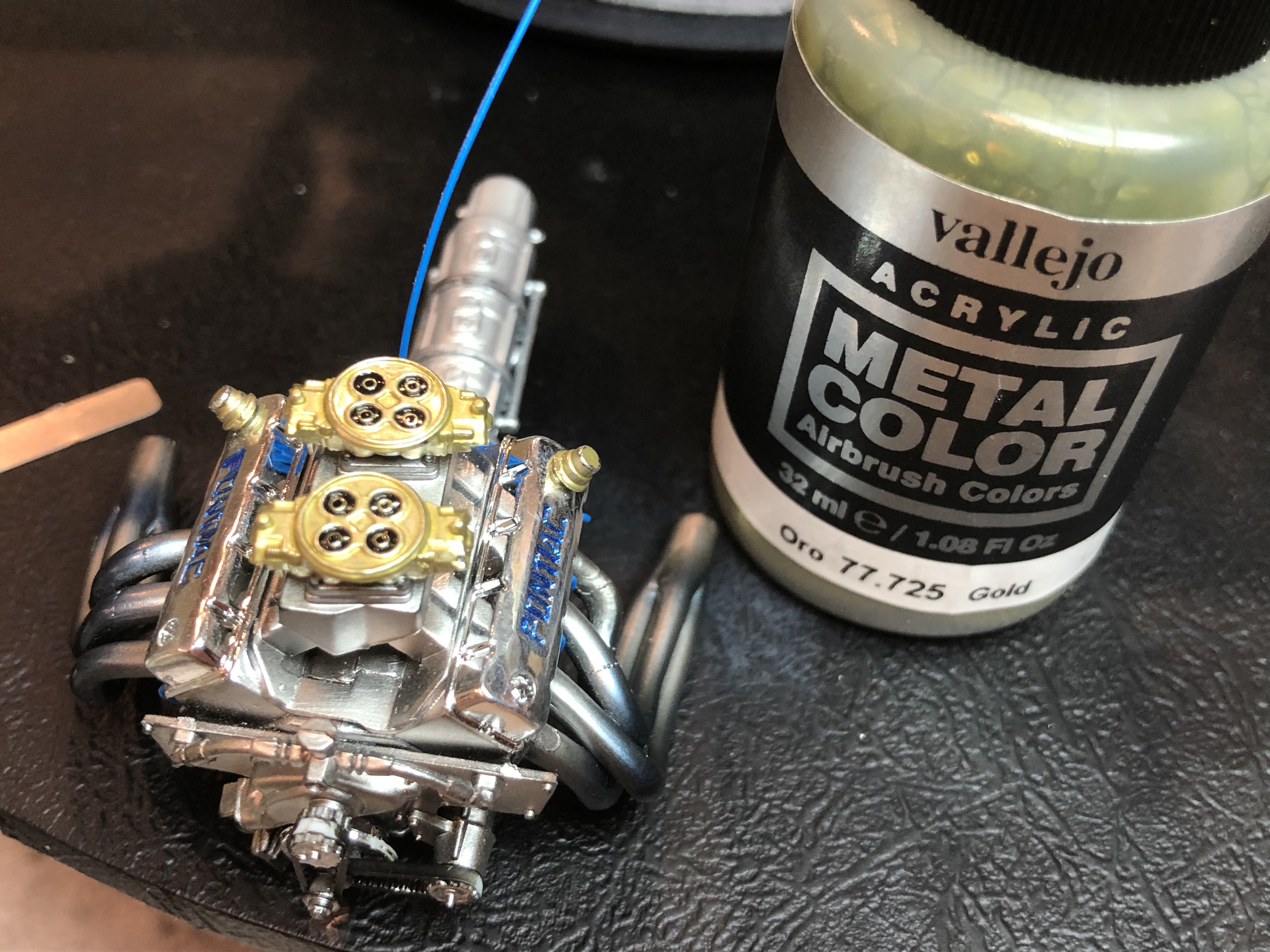 The dual carbs got a brushed coat of Vallejo Metal Colour Gold (77.725) and some Tamiya Black PLW in the ports.