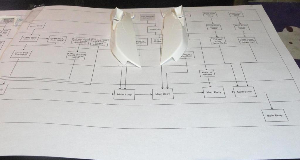 Mark, great to see your build making some real progress here, and the flow chart is an excellent tool. This is pretty much what I try to do in my head, but inevitably a few parts are missed from each stage so the airbrush gets reloaded a day or two later. I have a notebook on the bench, and I also often use a red pen to circle stages in the instruction sheets where I think it would be best to throw paint around.