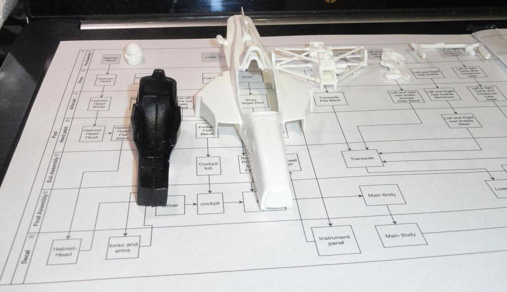 I ended up having to flow chart all of the steps and map out the priming, painting, masking, more painting, decaling, sub-assemblies, decals, more assemblies, more decals.