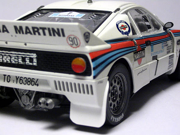 That Pirelli text goes on top of a panel that has a deep texturing. I thoght that I could never get a decal to conform to such texturing. How wrong I was! I just placed the decal, made cuts with a new knife blade over the decal where the recesses are (over the whole lenght of the decal, not just the holes), and then applied micro sol generously over the decal. After drying overnigth the decal had conformed neatly over the holes (well, not perfectly, but well enough it can't be seen with a quick glance. Still visible are some black showing through the holes in the decals, I'll touch up those with white) I also used generous amounts of micro sol with decals on the chassis. Everything went as planned and I applied a final gloss coat with Johnson floor wax (same stuff as future).