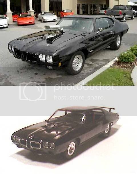 The first thing I had to do was cut up junkyard 67 Chevelle I had bought for the engine, salvage it's narrow rear end and wheelwel section and attach it to the GTO frame. (I used parts from the original MPC 72 GTO kit for refs again, they're red)